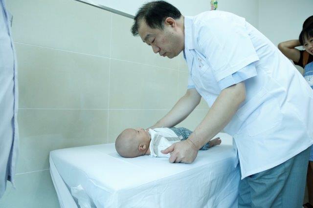 新生儿义诊专家孔祥永教授在为患儿做体格检查